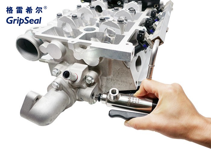 第一步 G80L手柄式,压下手柄,爪牙伸出并处于收缩状态。对准待测工件管口,注意螺纹位置。 | 第二步 向测试件内螺纹接口方向插入接头,到螺纹端面完全接触主密封圈,形成挤压。 | 第三步 松开G80L把手,金属夹爪会在弹簧张力作用下张开,从而与工件内部螺牙契合,完成密封 |