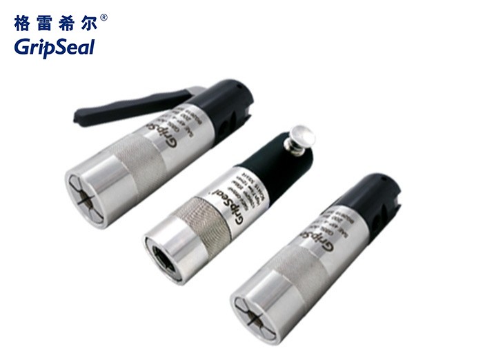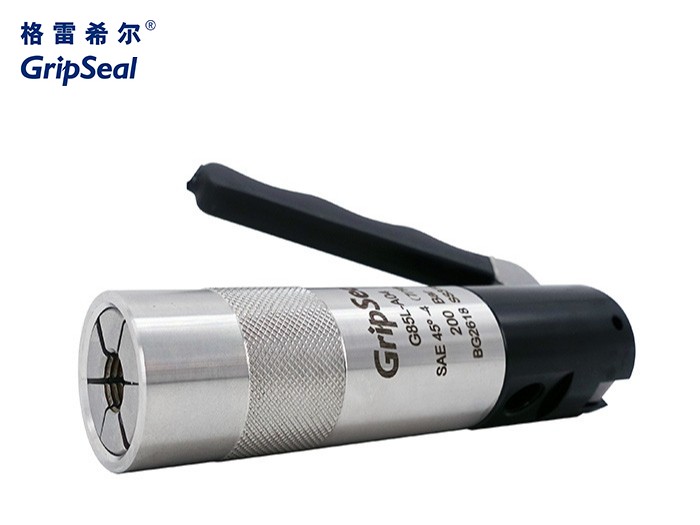 第一步 G85L手柄式,压下手柄,爪牙伸出并处于扩张状态。接头前端对准工件管口,注意螺牙位置 | 第二步 向测试件螺纹接口方向推动,到螺纹端面完全接触主密封圈。 | 第三步 松开G85L把手,金属夹爪在弹簧作用下收缩,,与工件螺牙形成契合,压紧端面密封圈,形成密封。 |